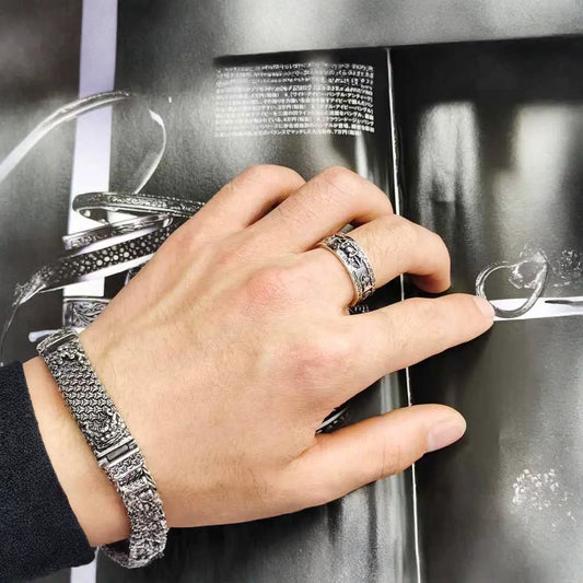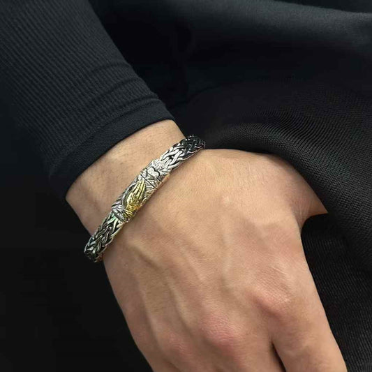 WcArts - Tang Lion Armor Beaded Cuff (Masculine Silver Bracelet)